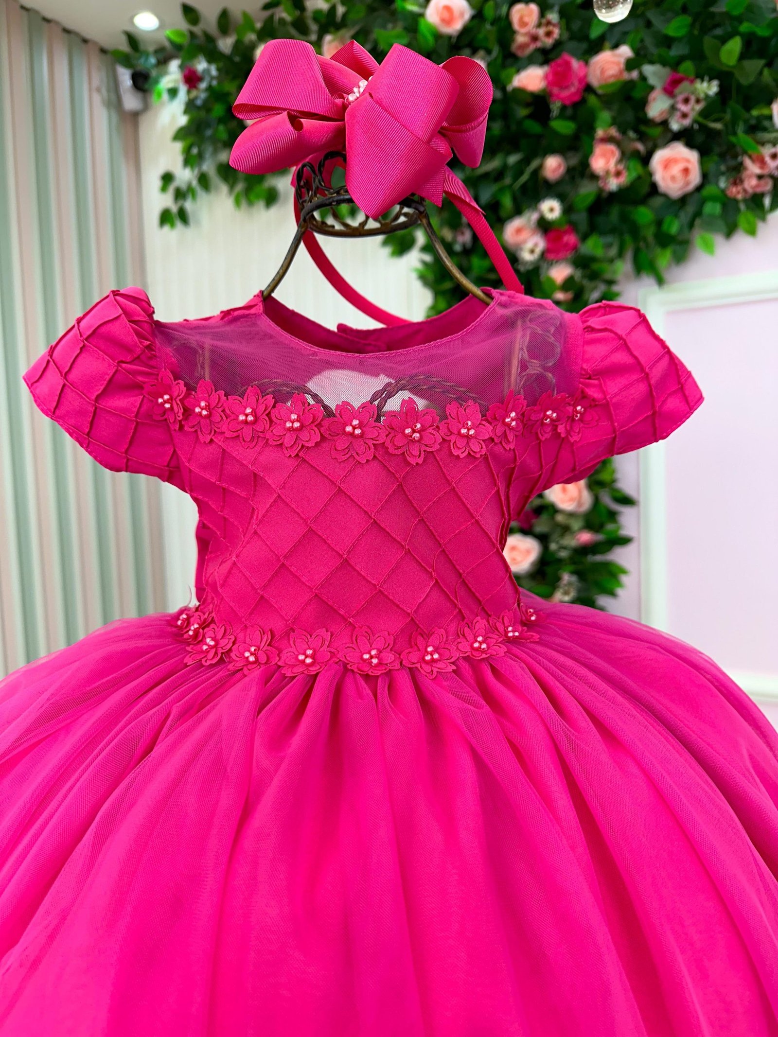 Confeccionado em tecido misto possui forro em poliéster e algodão para não incomodar a criança e proporcionando um caimento incrível e sofisticado, possui gola redonda, comprimento médio, mangas curtas, possui elástico nas costas para melhor ajuste, acabamento com lindo laço na parte posterior do vestido completa o look dos sonhos!