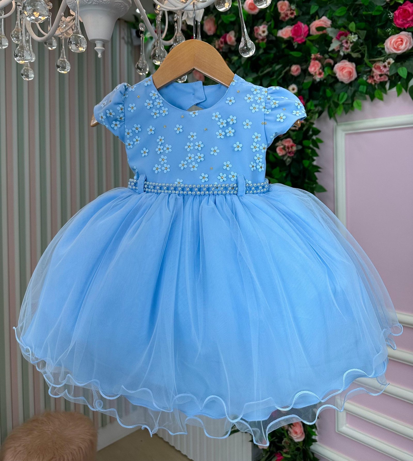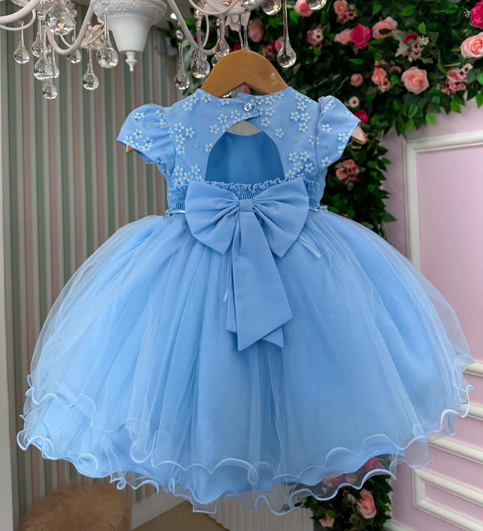 Confeccionado em tecido misto possui forro em poliéster e algodão para não incomodar a criança e proporcionando um caimento incrível e sofisticado, possui gola redonda, comprimento médio, mangas curtas, possui elástico nas costas para melhor ajuste, acabamento com lindo laço na parte posterior do vestido completa o look dos sonhos!
