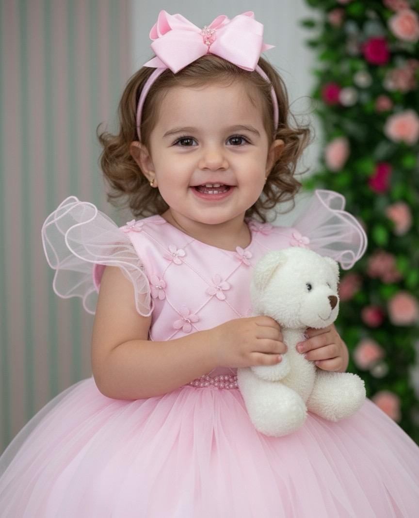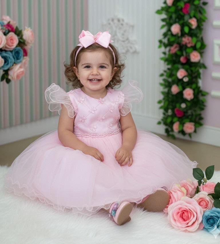 Confeccionado em tecido misto possui forro em poliéster e algodão para não incomodar a criança e proporcionando um caimento incrível e sofisticado, possui gola redonda, comprimento médio, mangas curtas, possui elástico nas costas para melhor ajuste, acabamento com lindo laço na parte posterior do vestido completa o look dos sonhos!