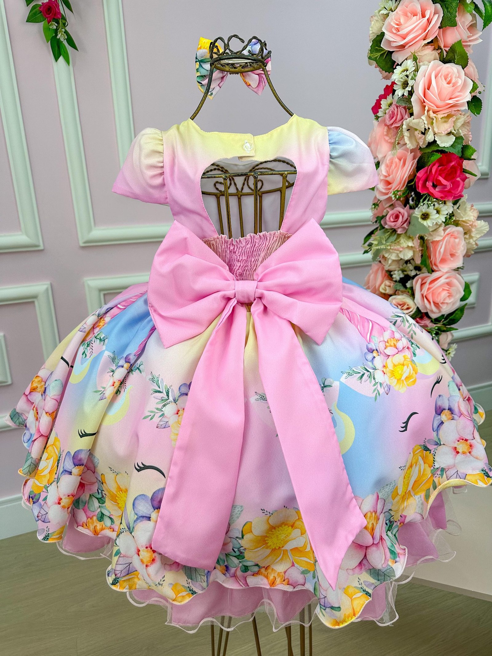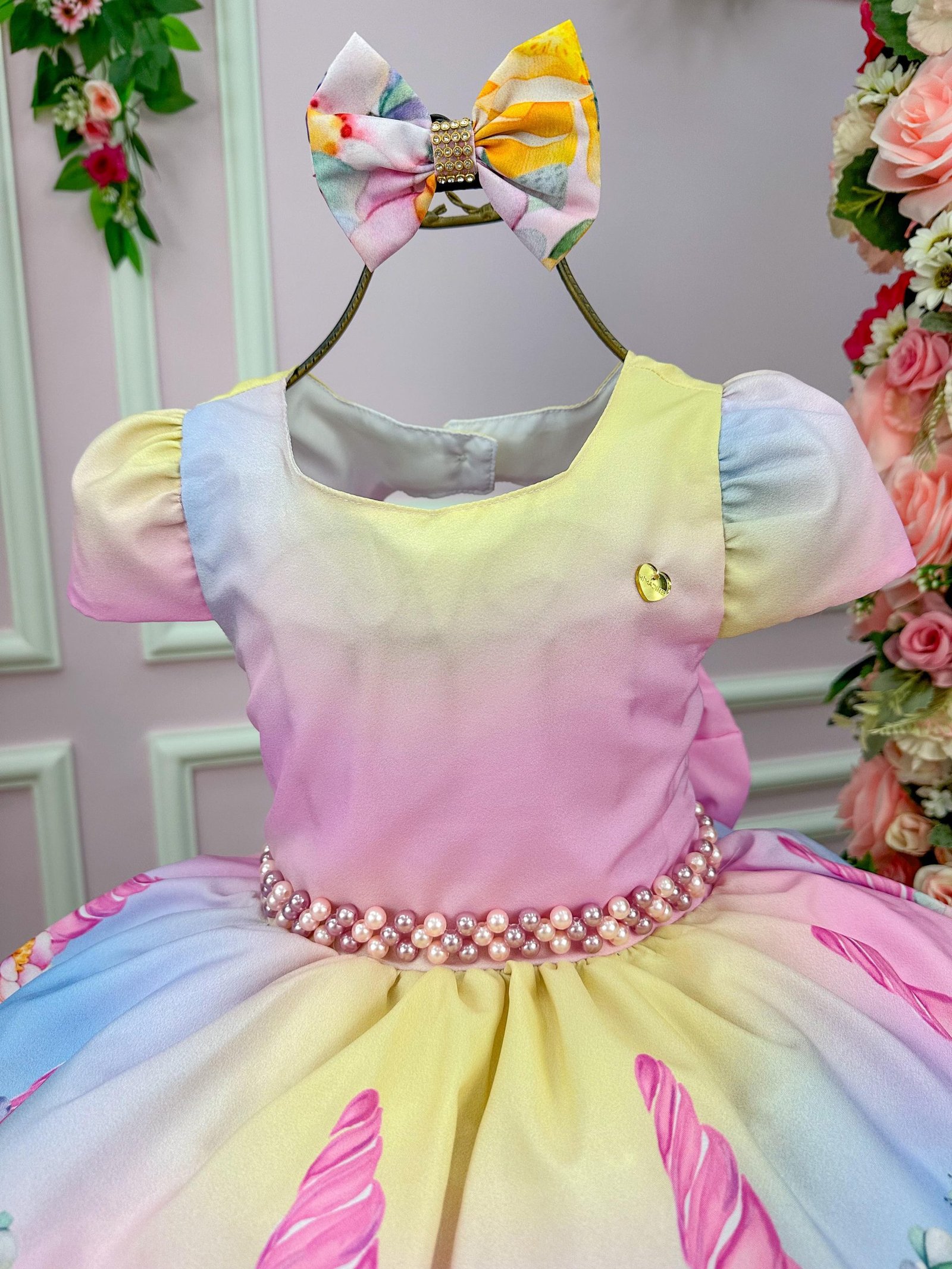 Confeccionado em tecido misto possui forro em poliéster e algodão para não incomodar a criança e proporcionando um caimento incrível e sofisticado, possui gola redonda, comprimento médio, mangas curtas, possui elástico nas costas para melhor ajuste, acabamento com lindo laço na parte posterior do vestido completa o look dos sonhos!