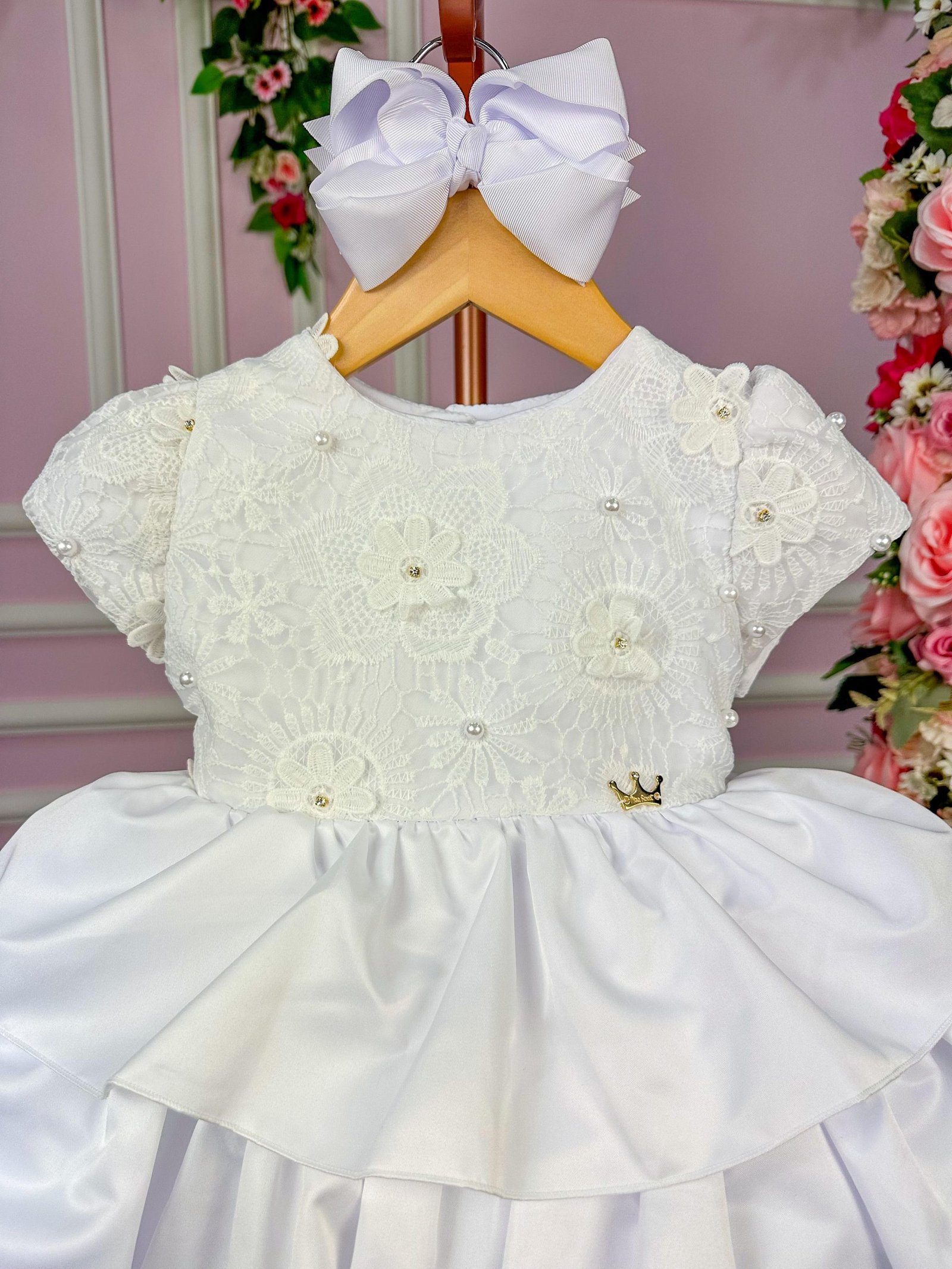 TECIDO Frente em gripper com rosas aplicadas e bordadas em perolas 100% poliester com saia em cetim 100% poliéster