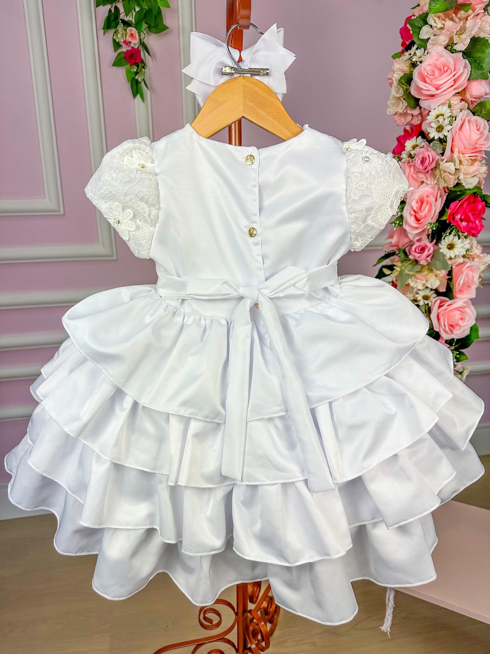 Confeccionado em tecido misto possui forro em poliéster e algodão para não incomodar a criança e proporcionando um caimento incrível e sofisticado, possui gola redonda, comprimento médio, mangas curtas, possui elástico nas costas para melhor ajuste, e acabamento com lindo laço na parte posterior do vestido completa o look dos sonhos!