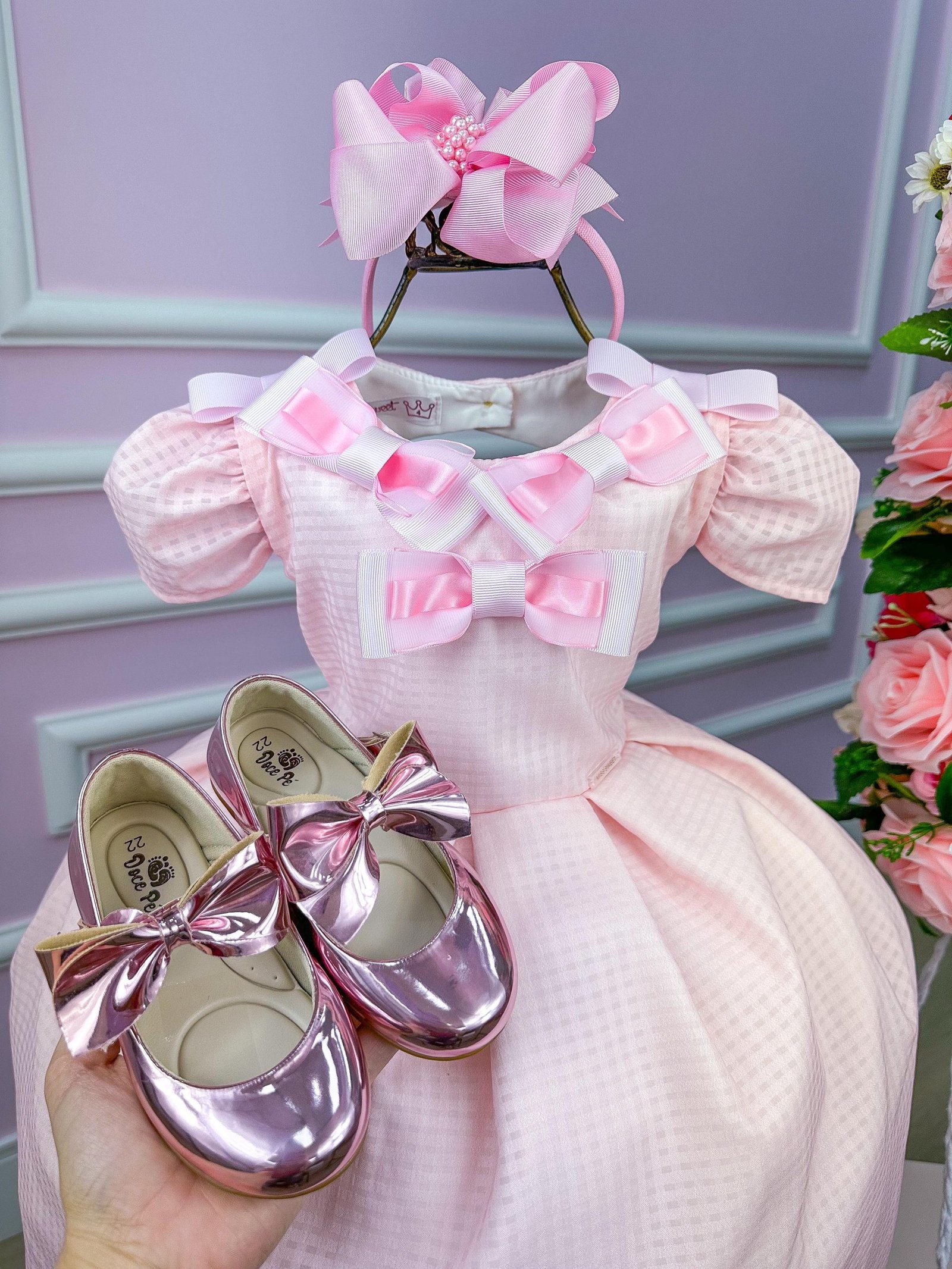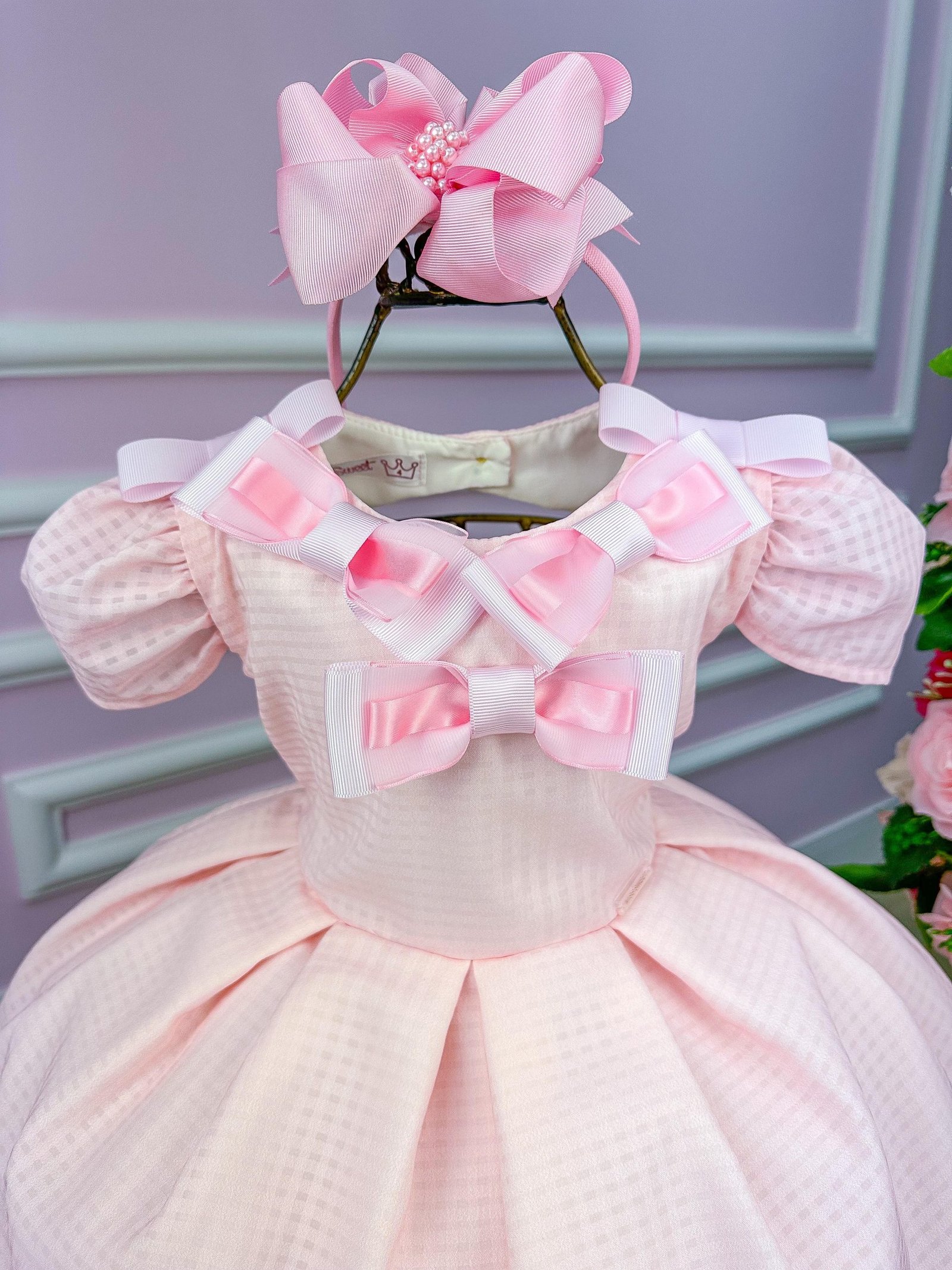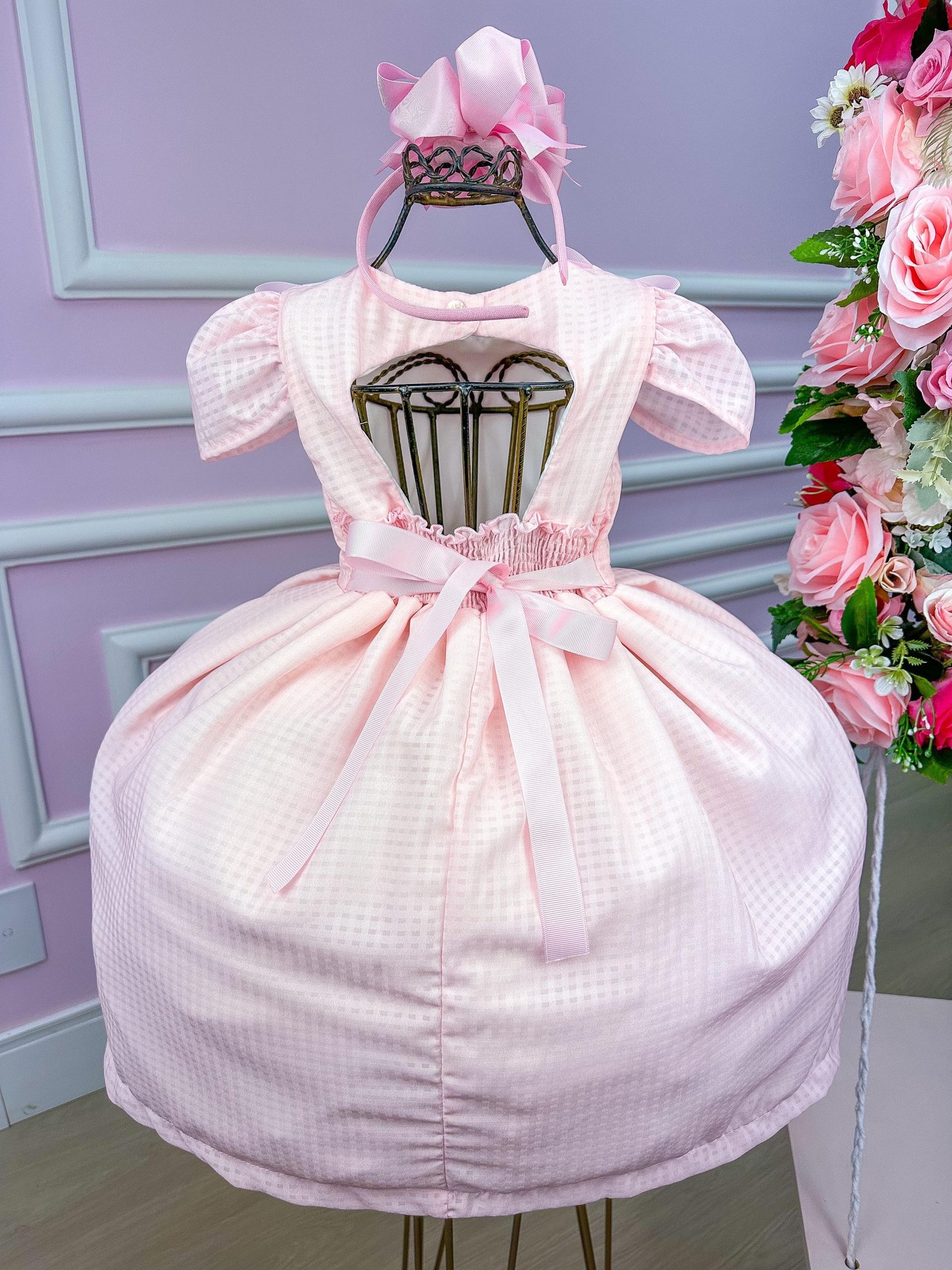 Confeccionado em tecido misto possui forro em poliéster e algodão para não incomodar a criança e proporcionando um caimento incrível e sofisticado, possui gola redonda, comprimento médio, mangas curtas, possui elástico nas costas para melhor ajuste, e acabamento com lindo laço na parte posterior do vestido completa o look dos sonhos!