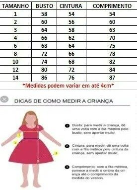 Confeccionado em tecido misto possui forro em poliéster e algodão para não incomodar a criança e proporcionando um caimento incrível e sofisticado, possui gola redonda, comprimento médio, mangas curtas, possui elástico nas costas para melhor ajuste, acabamento com lindo laço na parte posterior do vestido completa o look dos sonhos!
