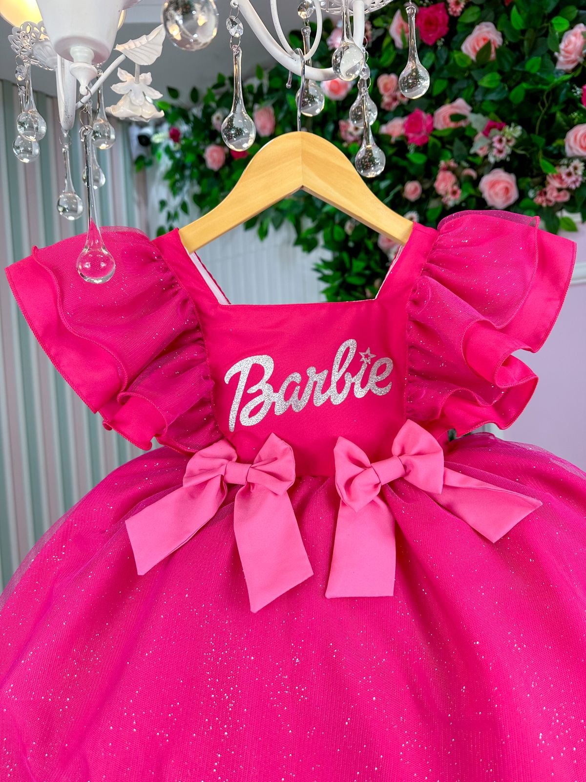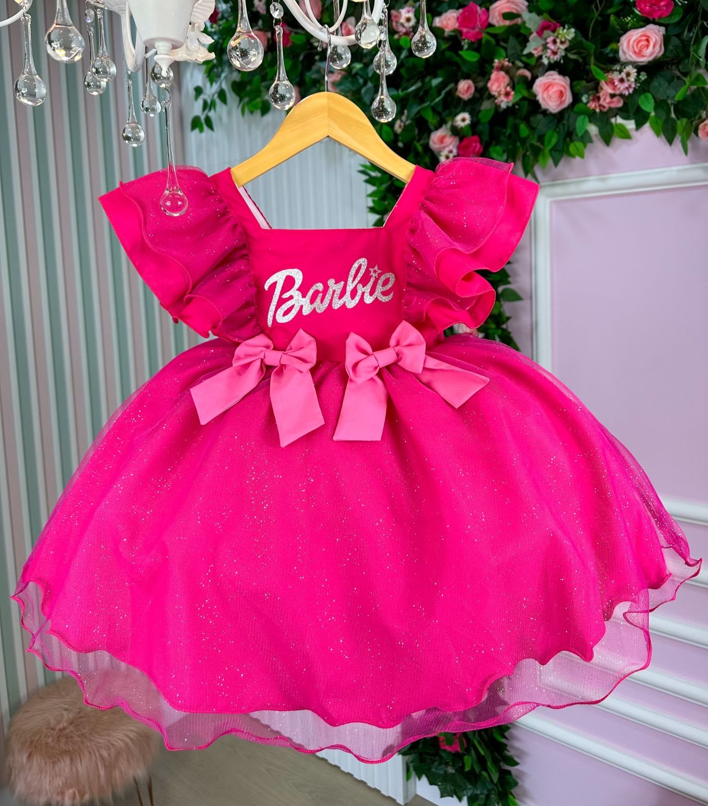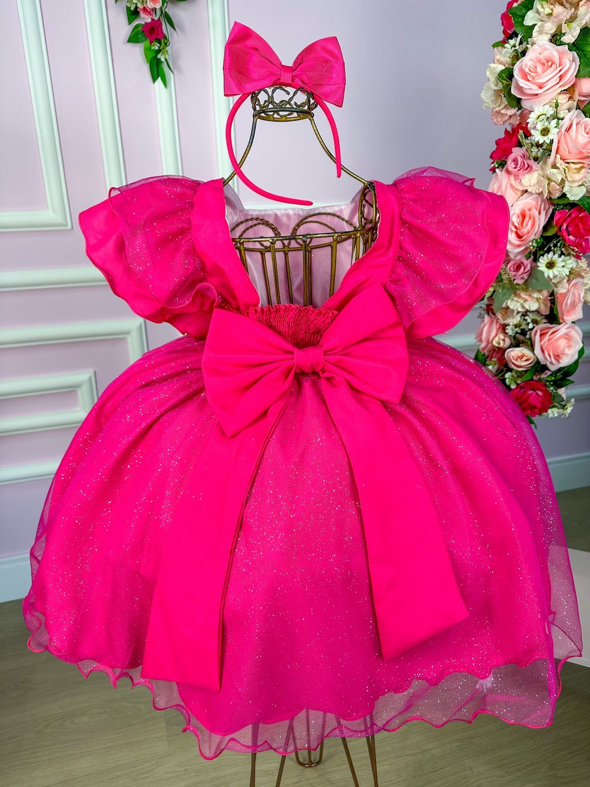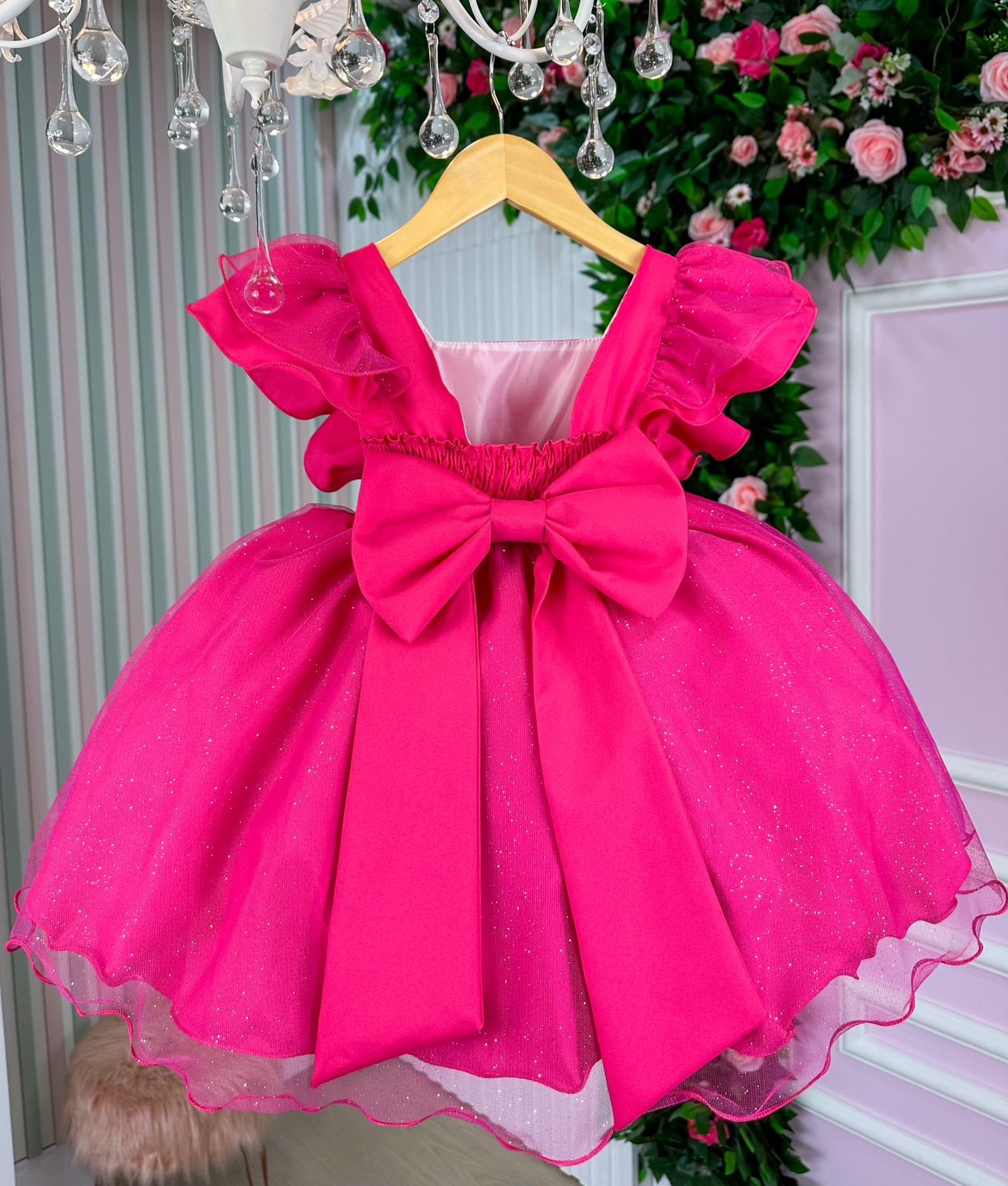 Confeccionado em tecido misto possui forro em poliéster e algodão para não incomodar a criança e proporcionando um caimento incrível e sofisticado, possui gola redonda, comprimento médio, mangas curtas de tule, possui elástico nas costas para melhor ajuste, acabamento com lindo laço na parte posterior do vestido completa o look dos sonhos!