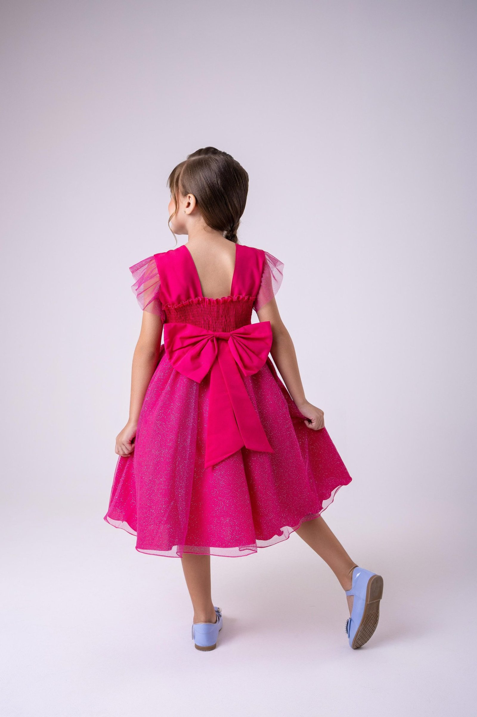Confeccionado em tecido misto possui forro em poliéster e algodão para não incomodar a criança e proporcionando um caimento incrível e sofisticado, possui gola redonda, comprimento médio, mangas curtas,  contém, também, elástico nas costas para melhor ajuste, acabamento com lindo laço na parte posterior do vestido completa o look dos sonhos!