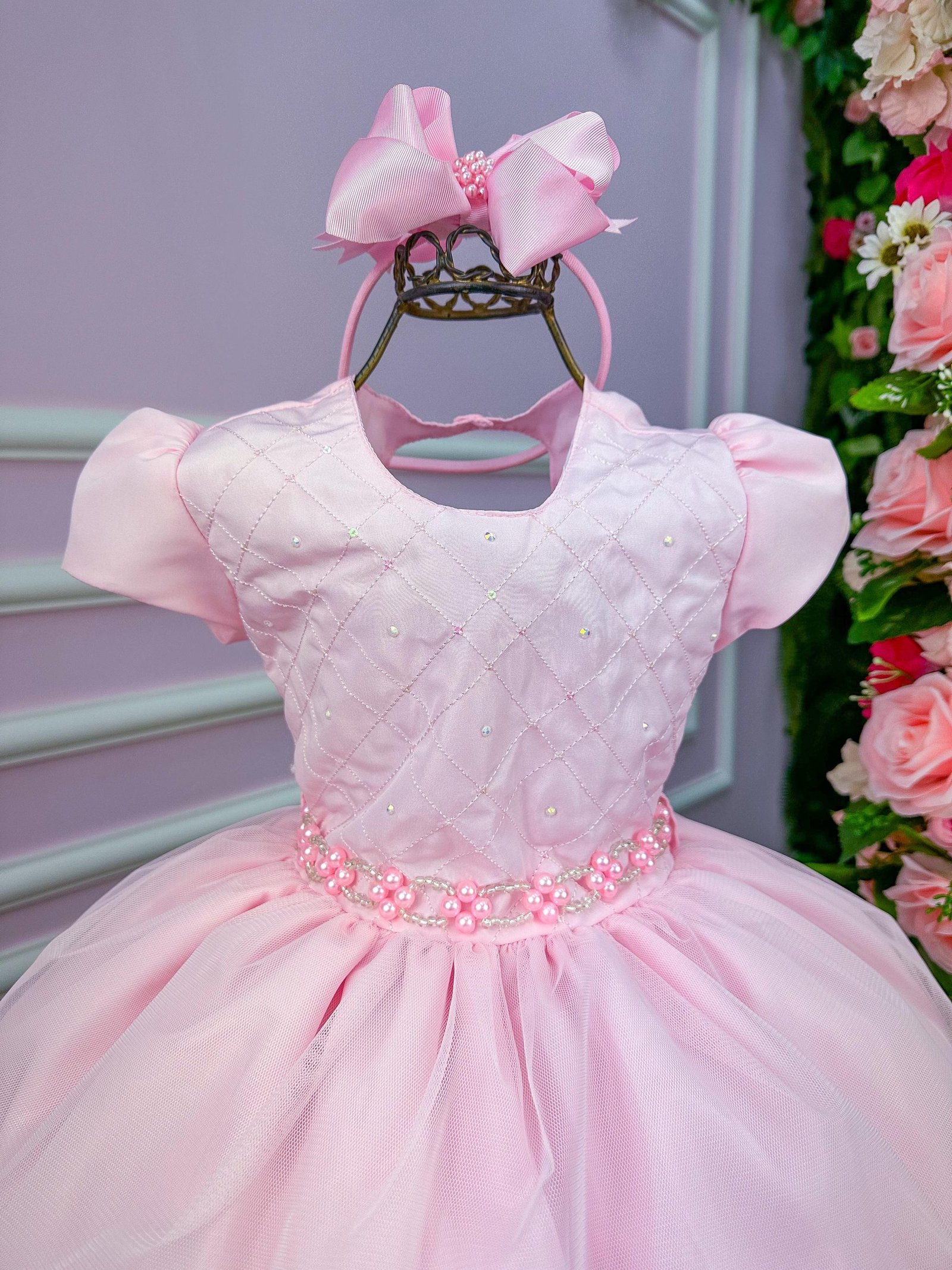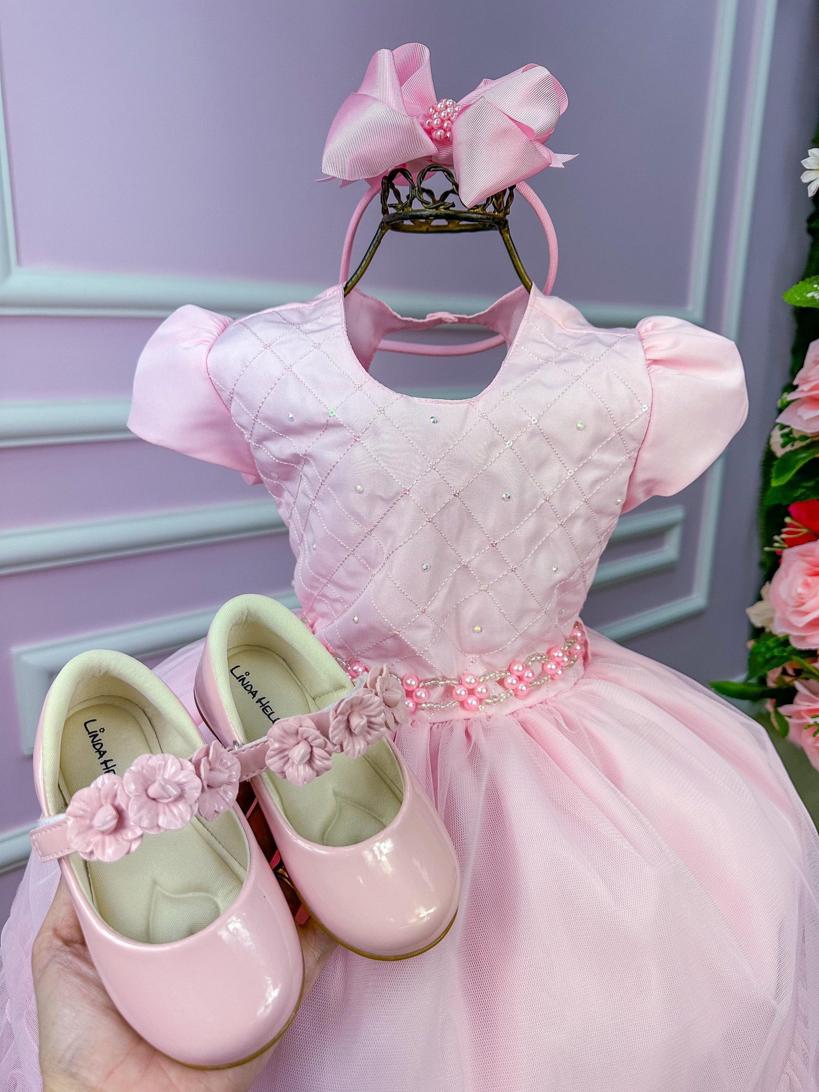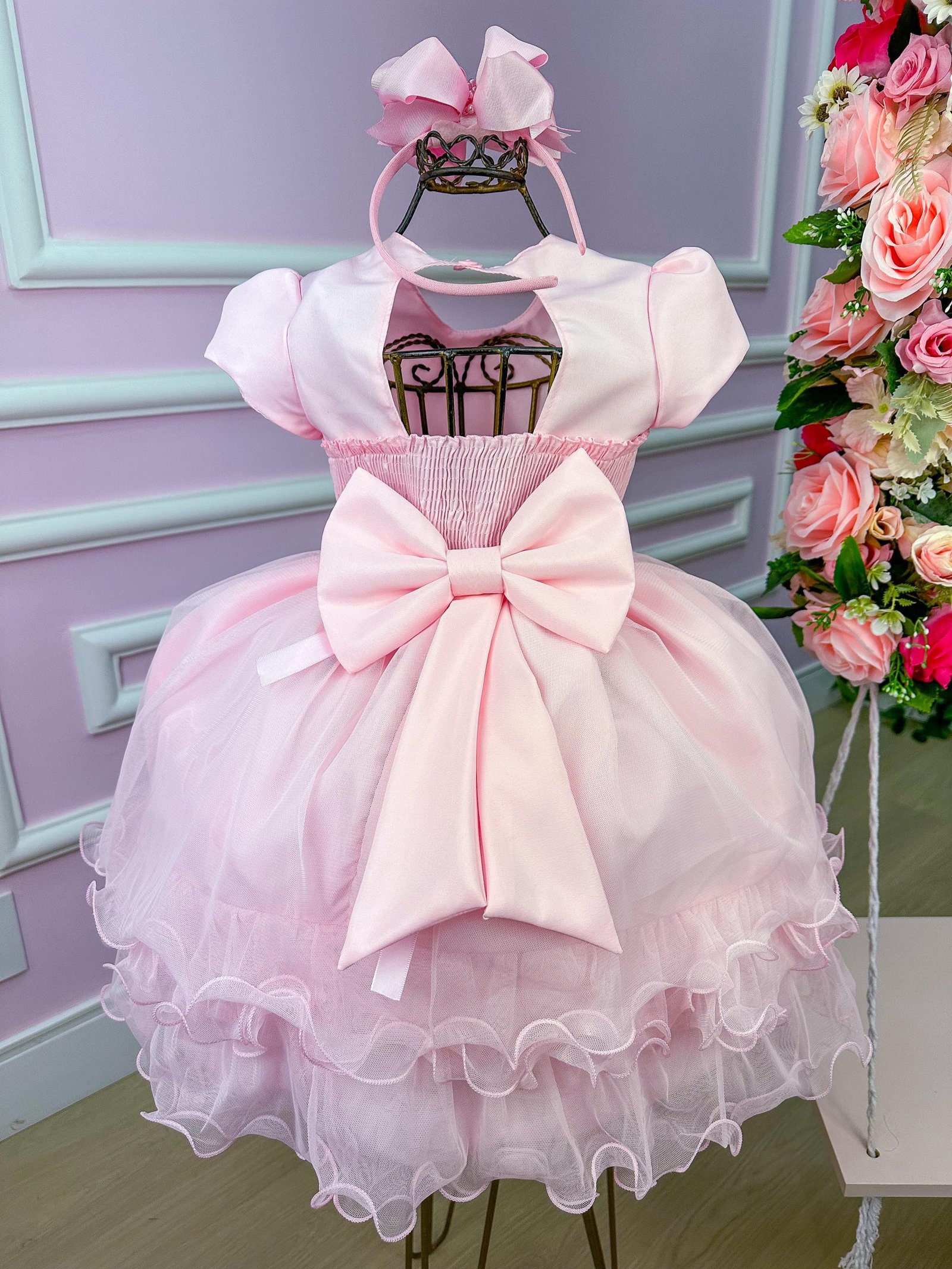 Confeccionado em tecido misto possui forro em poliéster e algodão para não incomodar a criança e proporcionando um caimento incrível e sofisticado, possui gola redonda,comprimento médio, mangas curtas, possui elástico nas costas para melhor ajuste, acabamento com lindo laço na parte posterior do vestido completa o look dos sonhos!