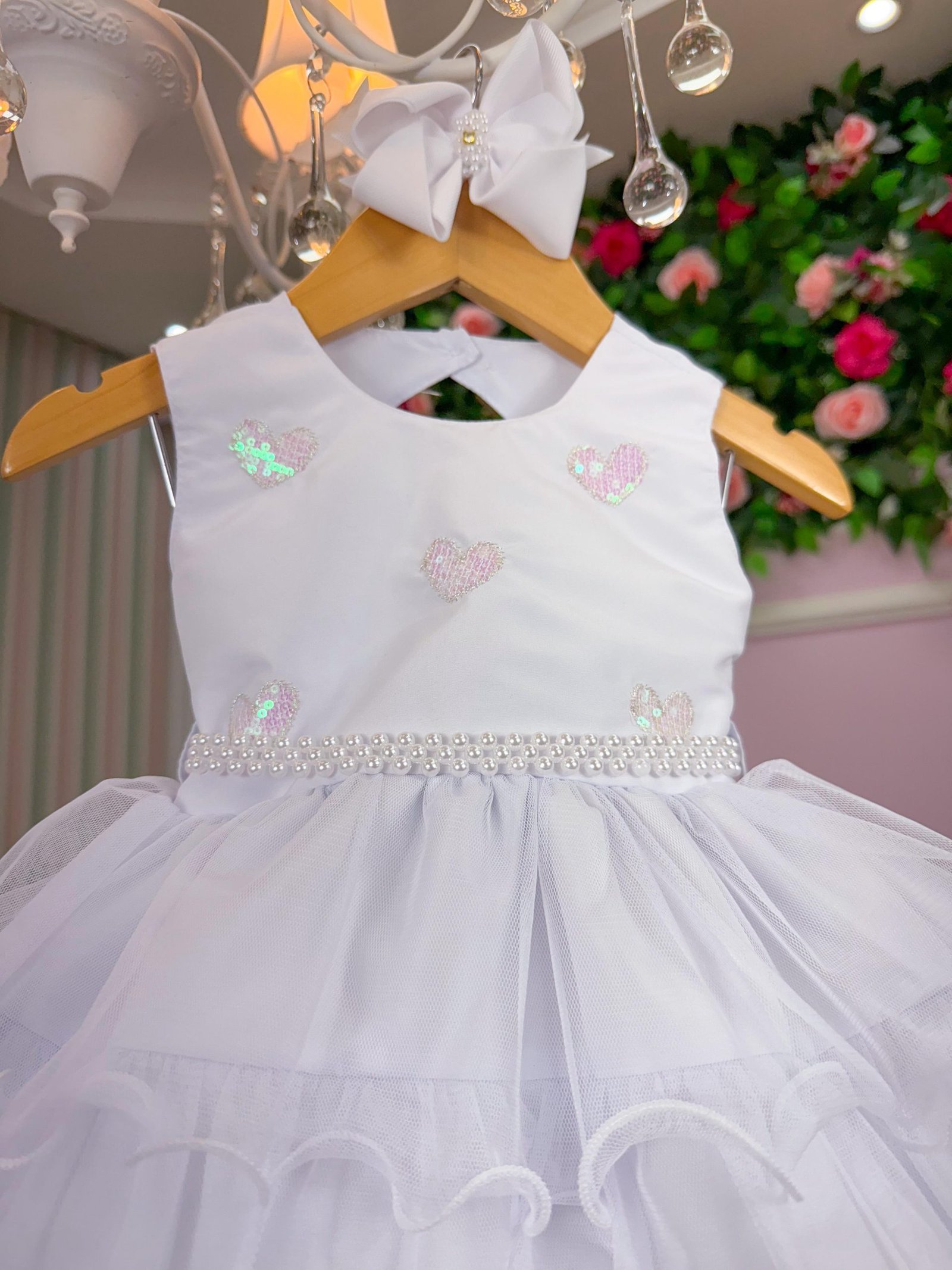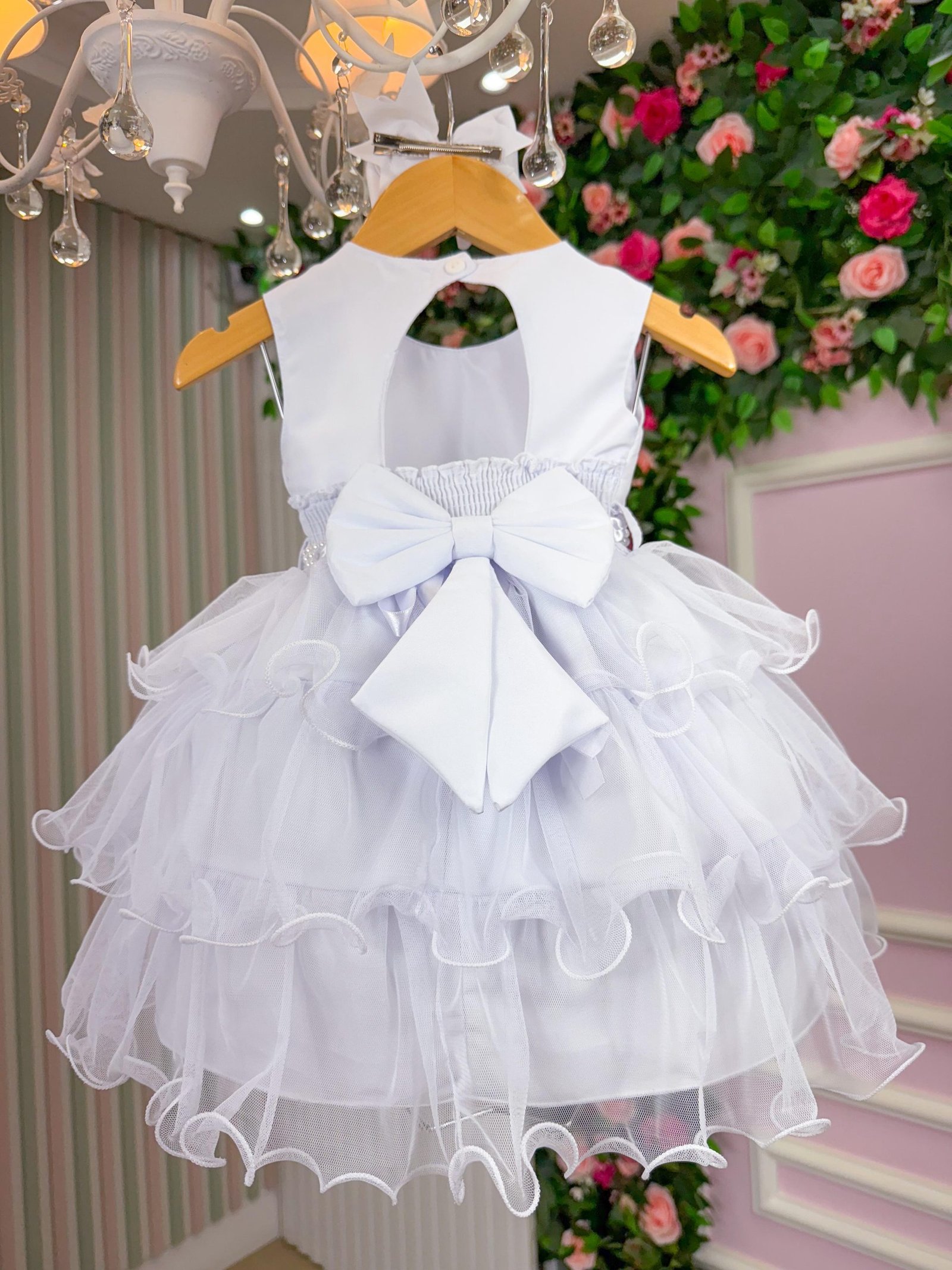Confeccionado em tecido misto possui forro em poliéster e algodão para não incomodar a criança e proporcionando um caimento incrível e sofisticado, possui gola redonda,comprimento médio, mangas curtas, acabamento com lindo laço na parte posterior do vestido completa o look dos sonhos!