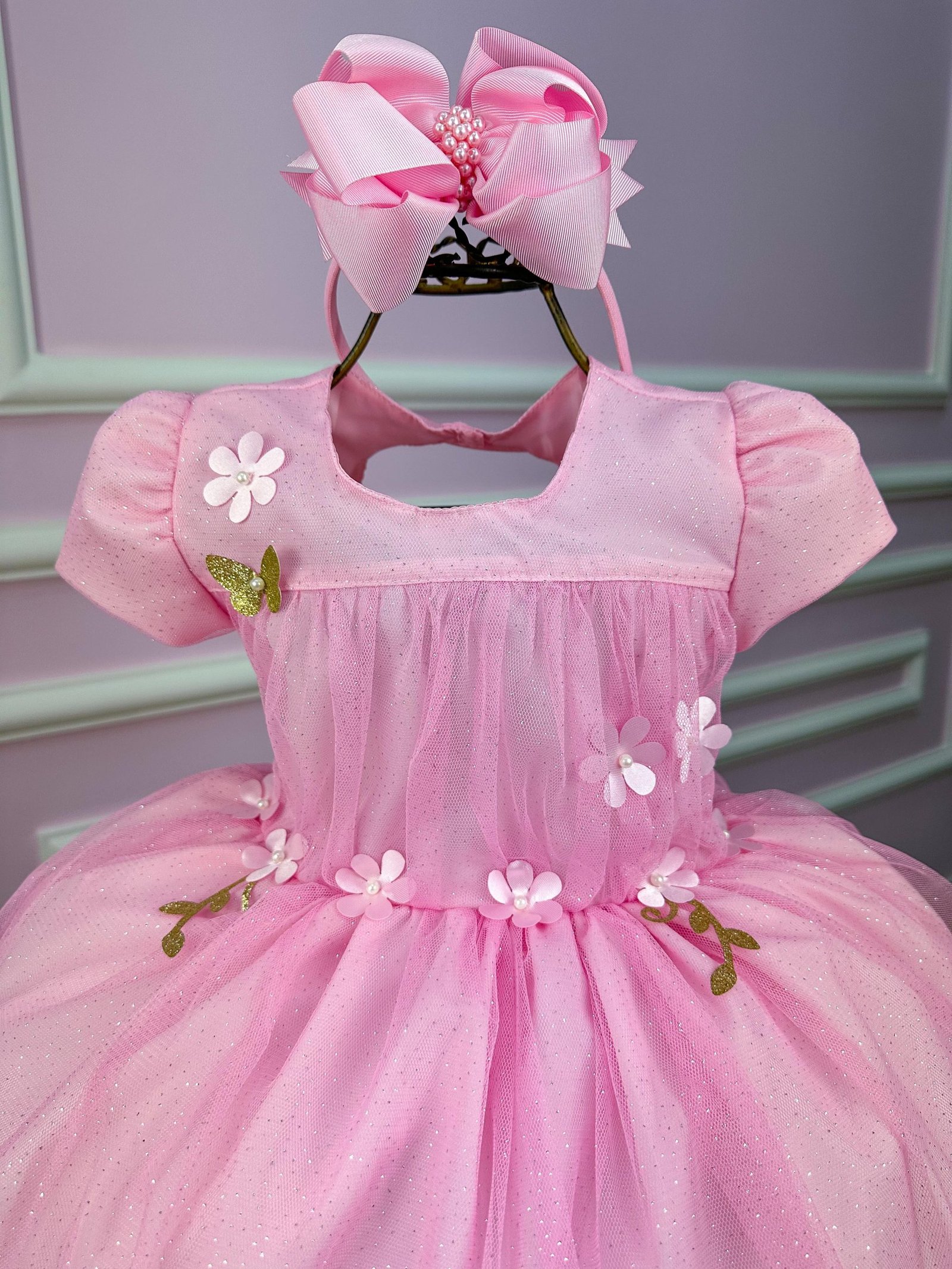 Confeccionado em tecido misto possui forro em poliéster e algodão para não incomodar a criança e proporcionando um caimento incrível e sofisticado, possui gola redonda,comprimento médio, mangas curtas, possui elástico nas costas para melhor ajuste, acabamento com lindo laço na parte posterior do vestido completa o look dos sonhos!