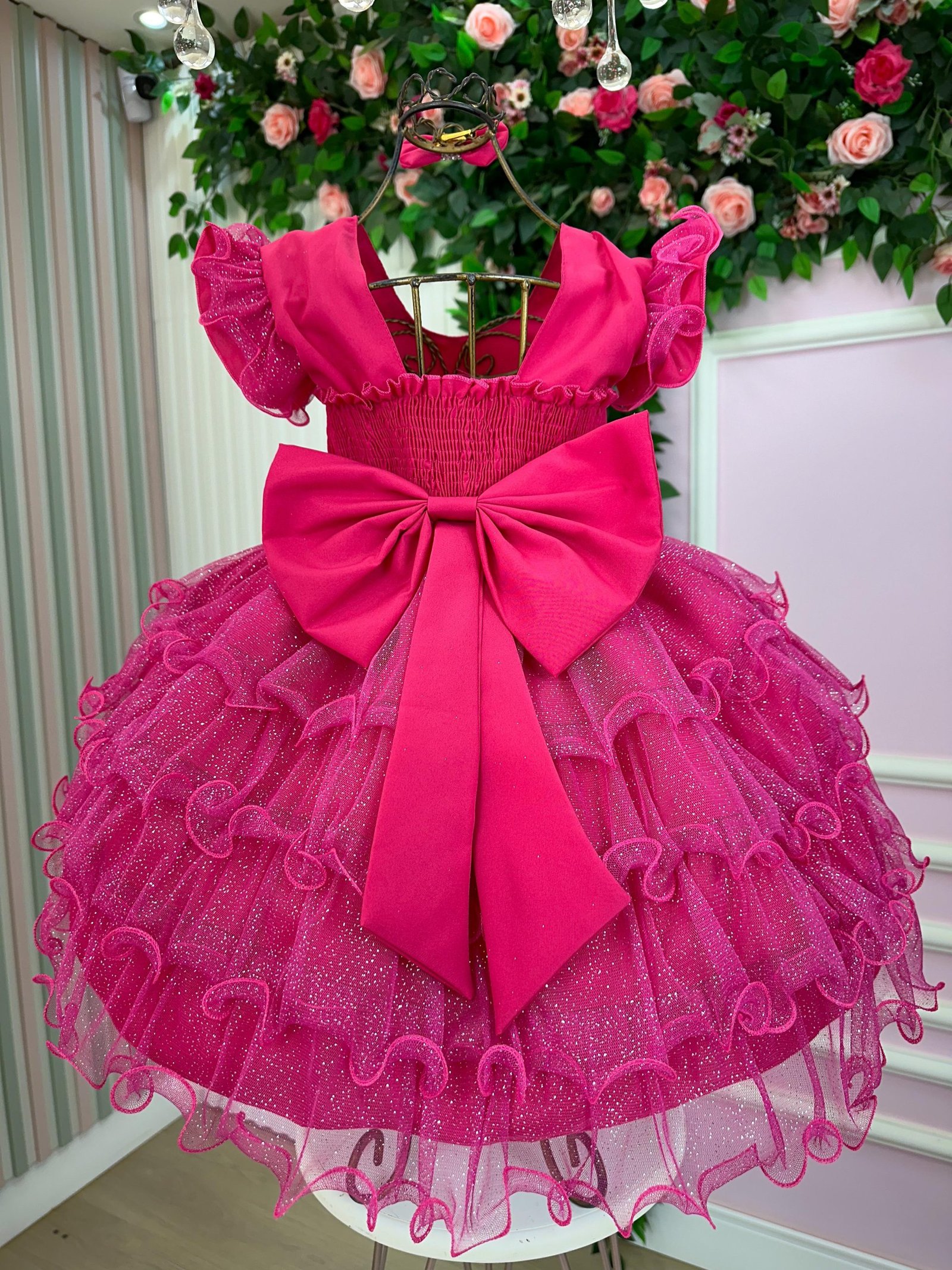 Confeccionado em tecido misto possui forro em poliéster e algodão para não incomodar a criança e proporcionando um caimento incrível e sofisticado, possui gola redonda, comprimento médio, mangas curtas, contém, também, elástico nas costas para melhor ajuste, acabamento com lindo laço na parte posterior do vestido completa o look dos sonhos!