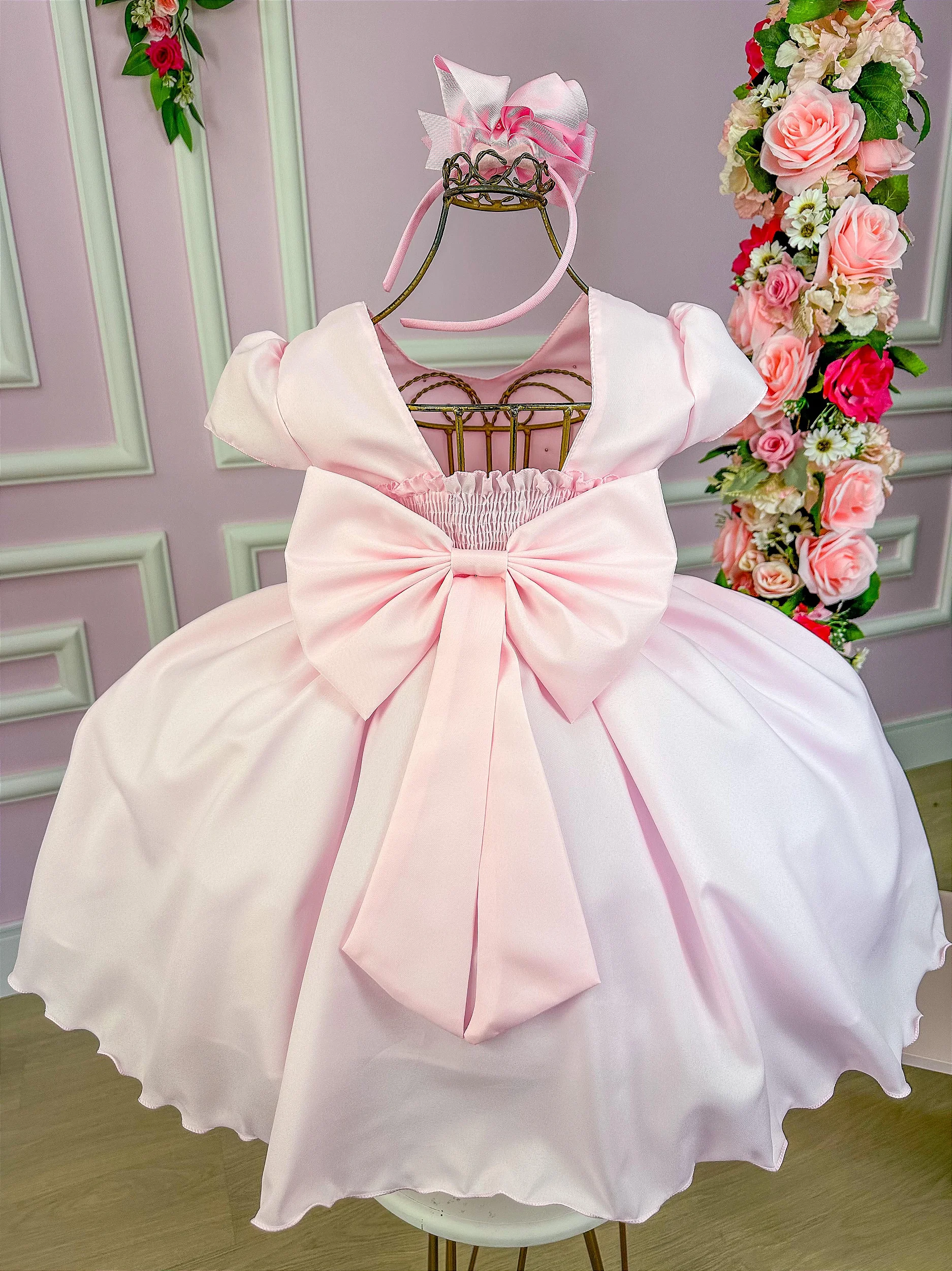 Confeccionado em tecido misto possui forro em poliéster e algodão para não incomodar a criança e proporcionando um caimento incrível e sofisticado, possui gola redonda, comprimento médio, mangas curtas,  contém, também, elástico nas costas para melhor ajuste, acabamento com lindo laço na parte posterior do vestido completa o look dos sonhos!